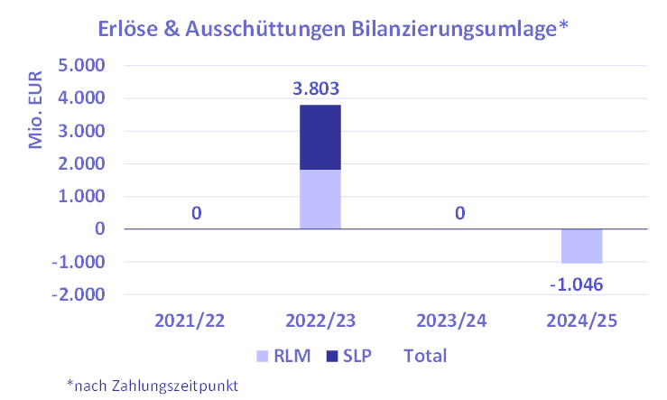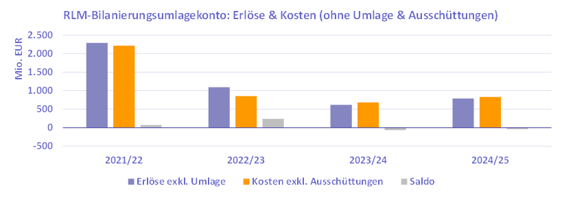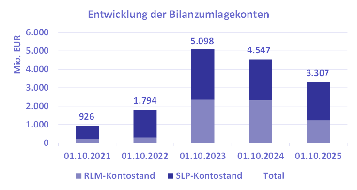 Der Anstieg der Kontostände im Vergleich zur Zeit vor der Energiekrise von 2022 ist im Wesentlichen auf die Erhebung von Bilanzierungsumlagen im GWJ 2022/23 zurückzuführen, die zu Erlösen von (in Summe) 3,8 Mrd. Euro führte. Eine Ausschüttung in Höhe von 1,05 Mrd. Euro erfolgte aus dem RLM-Konto für die Umlageperiode des GWJ 2023/24 (die Auszahlung erfolgte im GWJ 2024/25).