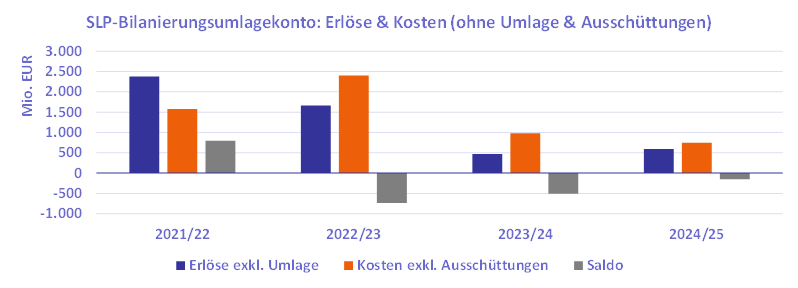 Abgesehen von den Erlösen aus der Umlage und von den Ausschüttungen befanden sich die Erlöse und Kosten auf dem RLM-Bilanzierungsumlagekonto über die Jahre annähernd im Gleichgewicht; Überschüsse oder Fehlbeträge waren stets sehr gering. Im Vergleich dazu entstand auf dem SLP-Bilanzierungsumlagekonto im GWJ 2021/22 ein deutlicher Überschuss (von 797 Mio. Euro) und in den folgenden GWJ auch höhere Fehlbeträge (739 Mio. Euro in 2022/23, 511 Mio. EUR in 2023/24 und 153 Mio. Euro in 2024/25).