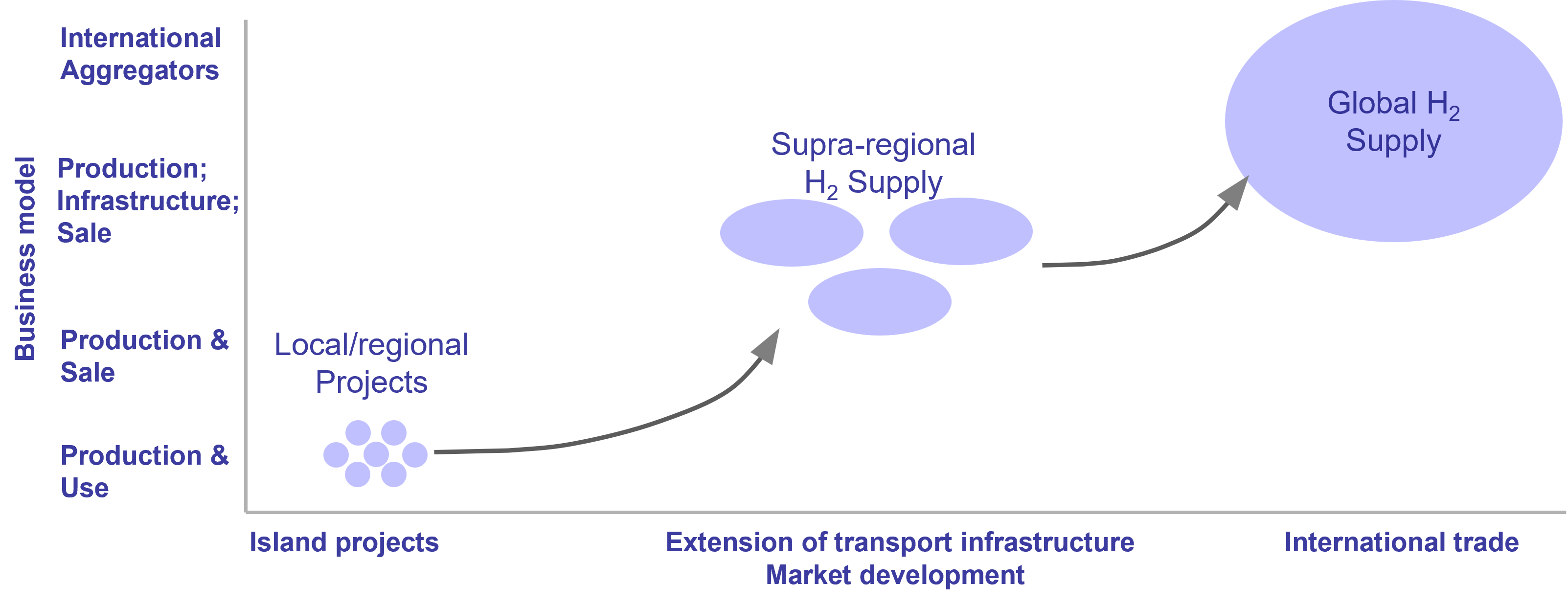 - The hydrogen market is still in the phase of island projects. The intended infrastructure expansion aims at a supra-regional supply and should enable global hydrogen trade in the long run.